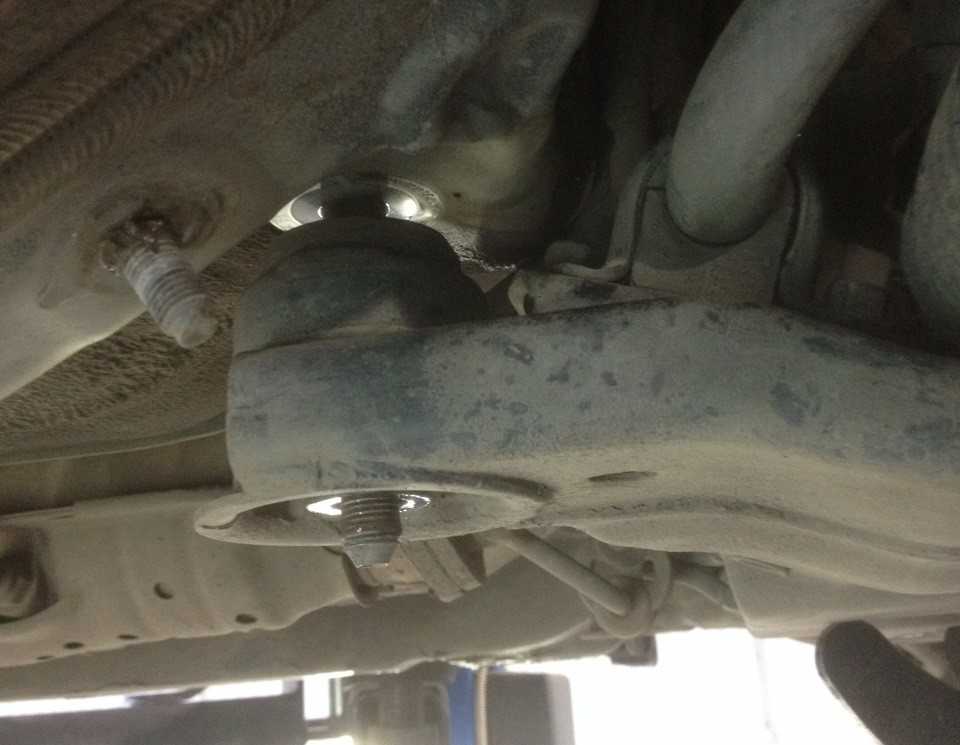 - Плавно опускаем домкрат на несколько сантиметров от кузова. Благодаря этому несколько опускается и подрамник, открывая доступ к втулкам.