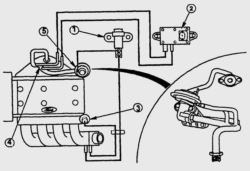 Рис. 8.6. Взаимосвязь элементов системы рециркуляции отработавших газов EGR: 1 – вакуумный регулятор EGR (EVR); 2 – электронный преобразователь перепада давлений (DPFE); 3 – регулятор давления топлива; 4 – секция перепада давлений; 5 – клапан EGR |