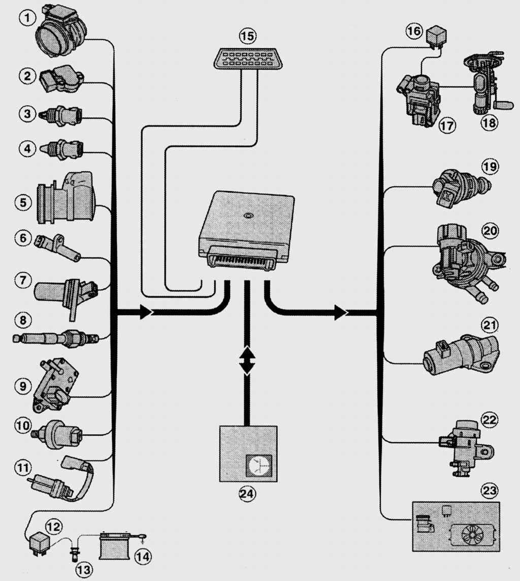Рис. 8.2. Основные элементы системы впрыска топлива EEC-V: 1 – измеритель расхода воздуха (MAP); 2 – датчик положения дроссельной заслонки (TP); 3 – датчик температуры поступающего в двигатель воздуха (IAT); 4 – датчик температуры охлаждающей жидкости (ECT); 5 – сцепление компрессора кондиционера; 6 – датчик угла поворота коленчатого вала (CKP); 7 – датчик положения распределительного вала (CMP); 8 – датчик кислорода (HО2S); 9 – электронный преобразователь перепада давлений; 10 – выключатель усилителя рулевого управления (PSP); 11 – датчик скорости (VSS); 12 – реле; 13 – выключатель зажигания с противоугонным устройством; 14 – аккумуляторная батарея; 15 – диагностический разъем (DLC); 16 – реле топливного насоса (FPR); 17 – предохранительный выключатель аккумуляторной батареи (IFS); 18 – топливный насос (FP); 19 – форсунка; 20 – электромагнитный клапан системы улавливания паров топлива EAVAP; 21 – клапан регулировки частоты вращения коленчатого вала двигателя на холостом ходу (IAC); 22 – вакуумный регулятор системы рециркуляции отработавших газов EGR (EVR); 23 – выключатель вентилятора системы кондиционирования воздуха; 24 – блок блокировки пуска двигателя (PATS) |