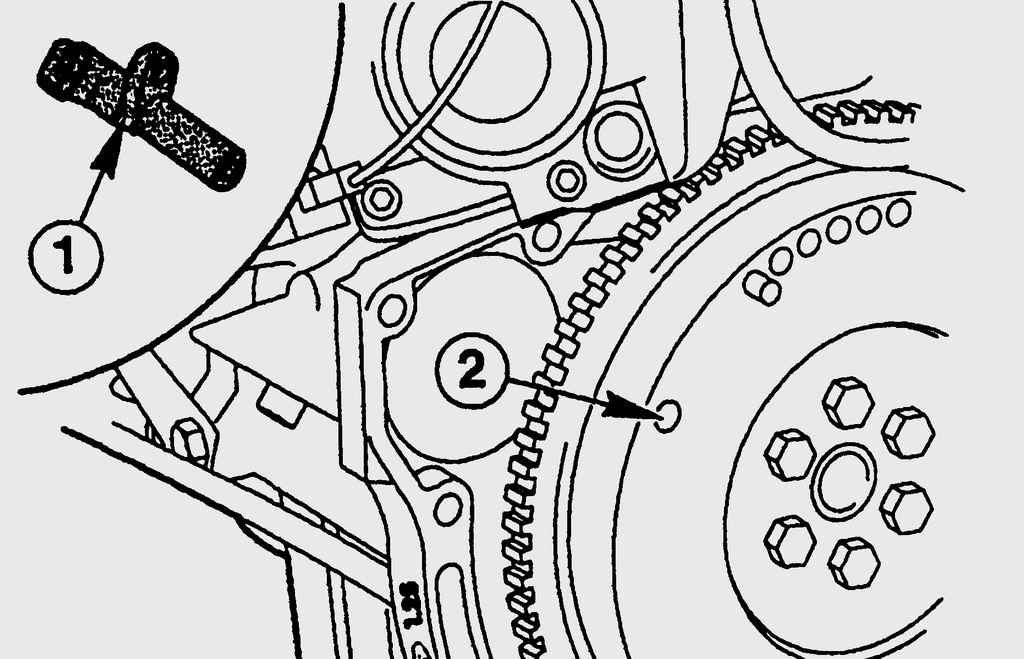 Рис. 8.4. Расположение датчика (1) угла поворота коленчатого вала и импульсного сектора на маховике (2) |