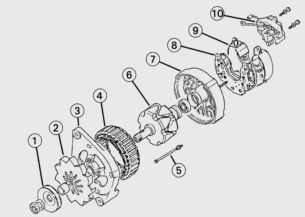 Рис. 15.3. Генератор: 1 – шкив поликлинового ремня; 2 – вентилятор; 3 – крышка генератора со стороны привода; 4 – обмотка статора; 5 – болт; 6 – ротор с двумя контактными кольцами; 7 – крышка генератора с опорным подшипником; 8 – выпрямитель; 9 – пластмассовый кожух; 10 – регулятор напряжения со щеткодержателями |