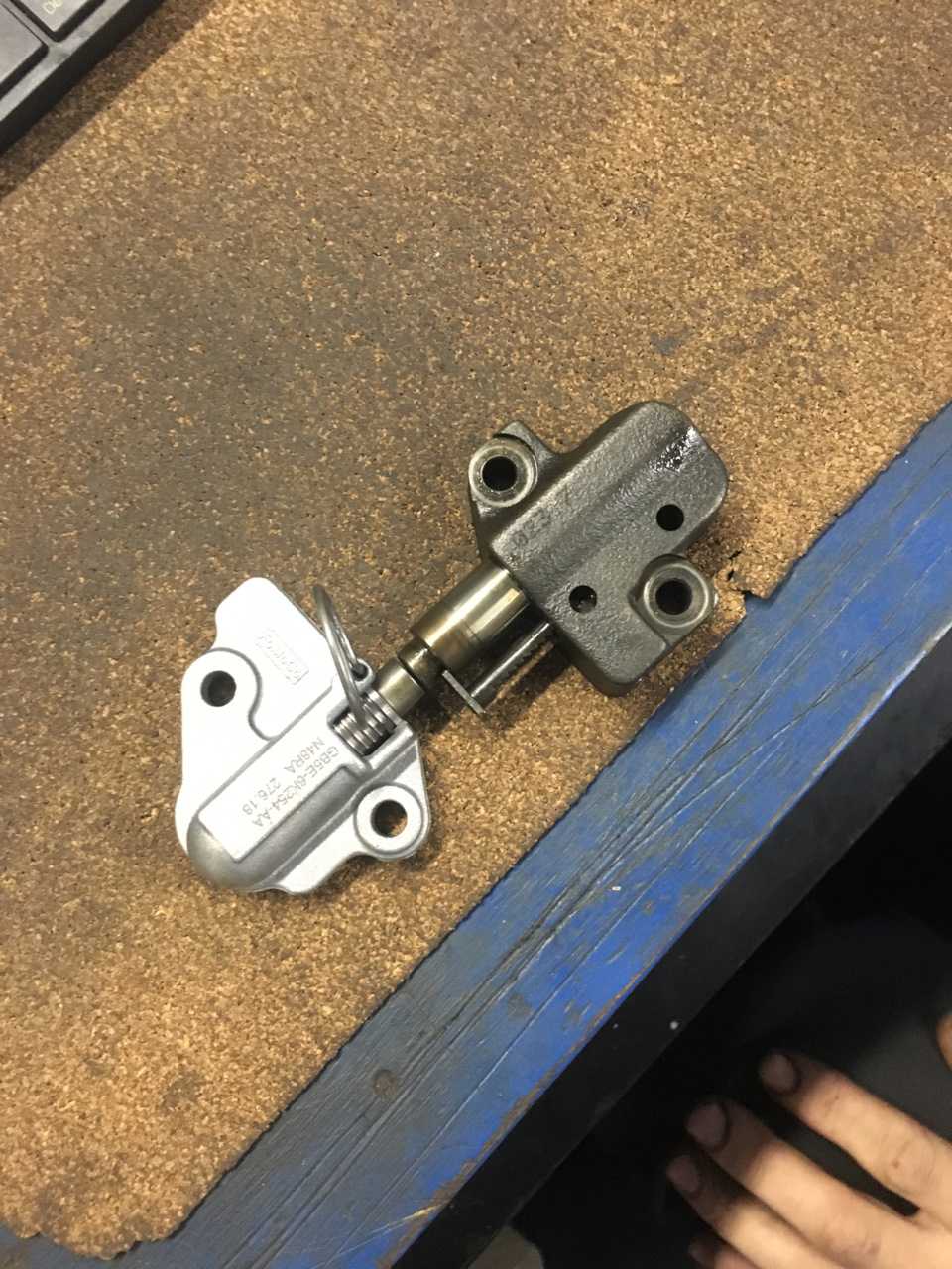 С лева внизу, возле звездочки распредвала затаился натяжитель цепи. В руководстве написано «Нажав тонкой отверткой на храповик через отверстие, разблокируйте натяжитель цепи, затем утопите шток, надавливая на башмак натяжителя и зафиксируйте шток натяжителя в утопленном положении, вставив подходящий стержень в отверстие.» Но поскольку это очень неудобно мы снимем натяжитель целиком а потом просто зарядим его на коленке.