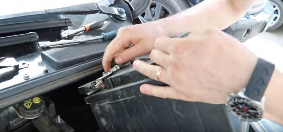 - Для начала необходимо выключить зажигание и все устройства, запитанные от аккумулятора. Демонтаж проводов АКБ осуществляется по очереди — сначала нужно отсоединять массу. Если вы являетесь владельцем автомобиля объемом 1.8 литра или 2-литрового турбодизеля, для снятия устройства потребуется произвести демонтаж воздушного фильтра.