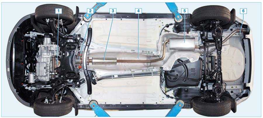 Расположение системы выпуска отработавших газов на автомобиле с кузовом хэтчбек:1 — катколлектор; 2 — металлокомпенсатор; 3 — дополнительный глушитель; 4 — теплозащитный экран; 5 — основной глушитель; 6 — подушка подвески системы выпуска