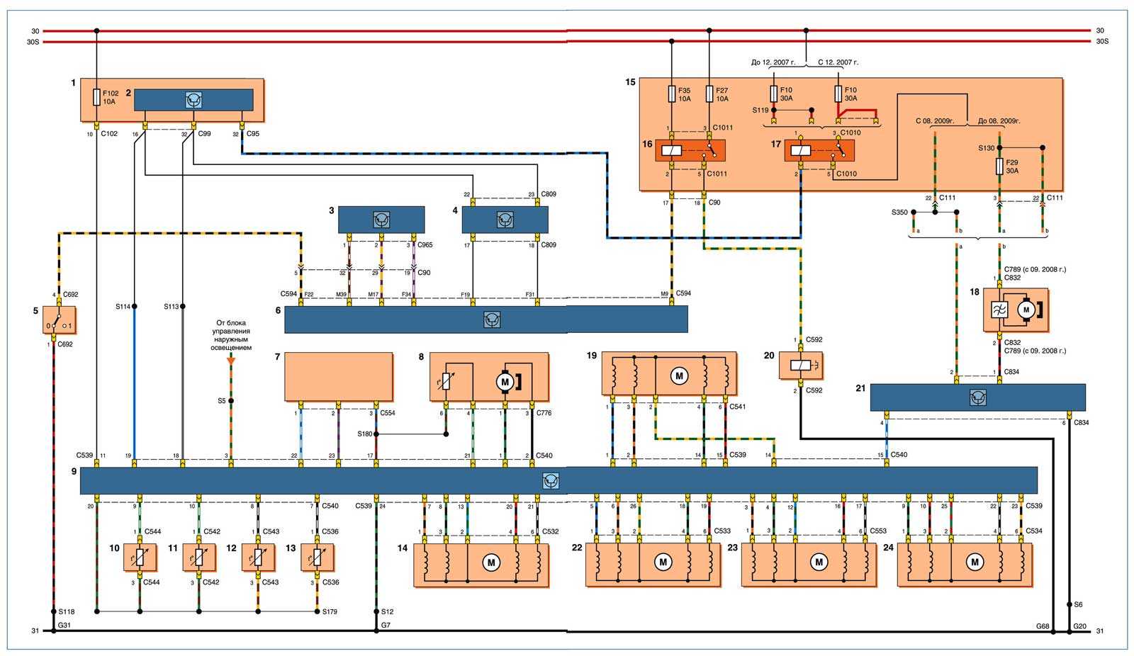 Схема соединений системы кондиционирования с автоматическим управлением (климат-контроль): 1 — монтажный блок в салоне; 2 — блок управления электропакетом; 3 — датчик давления хладагента; 4 — комбинация приборов; 5 — датчик низкого давления хладагента; 6 — ЭБУ; 7 — датчик освещенности на ветровом стекле; 8 — датчик температуры воздуха в салоне; 9 — блок автоматического управления кондиционером; 10 — датчик температуры воздуха подаваемого в ноги водителя; 11 — датчик температуры воздуха подаваемого в левые дефлекторы; 12 — датчик температуры воздуха подаваемого в правые дефлекторы; 13 — датчик температуры воздуха подаваемого в ноги пассажира; 14 — электропривод заслонки обдува ветрового стекла; 15 — монтажный блок в моторном отсеке; 16 — реле компрессора кондиционера; 17 — реле электродвигателя отопителя; 18 — электродвигатель отопителя; 19 — электропривод заслонки рециркуляции; 20 — муфта компрессора кондиционера; 21 — блок управления электродвигателем отопителя; 22 — электропривод заслонки подачи воздуха к дефлекторам панели приборов и к ногам водителя и пассажиров; 23 — электропривод левой заслонки регулирования температуры; 24 — электропривод правой заслонки регулирования температуры