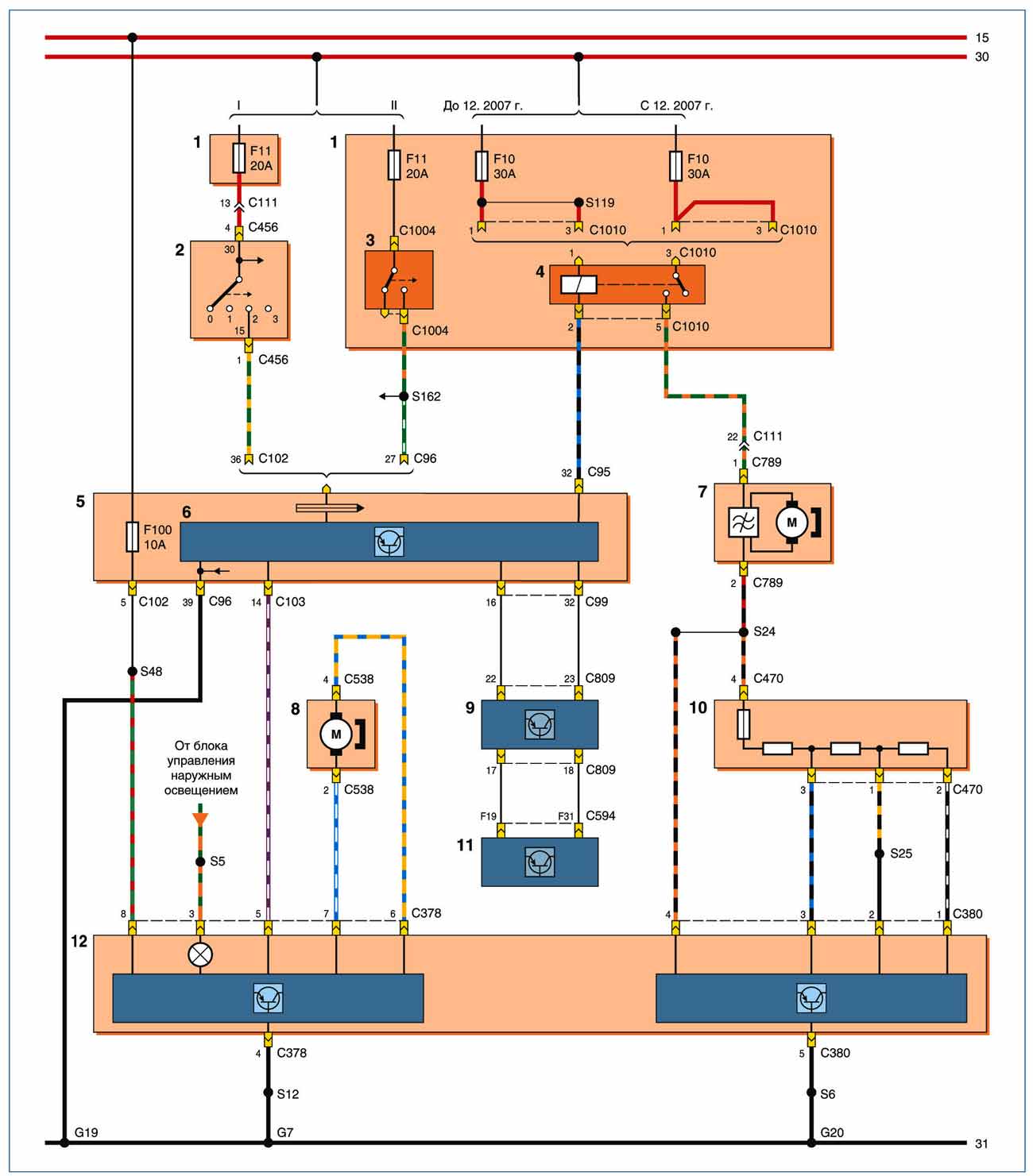 Схема соединений системы отопления и вентиляции: I — не оборудованным системой запуска двигателя без ключа; II — с системой запуска двигателя без ключа; 1 — монтажный блок в моторном отсеке; 2 — выключатель зажигания; 3 — реле зажигания; 4 — реле вентилятора отопителя; 5 — монтажный блок в салоне; 6 — блок управления электропакетом; 7 — электродвигатель отопителя; 8 — электропривод заслонки рециркуляции; 9 — комбинация приборов; 10 — дополнительный резистор вентилятора отопителя; 11 — ЭБУ; 12 — блок управления системой отопления и вентиляции