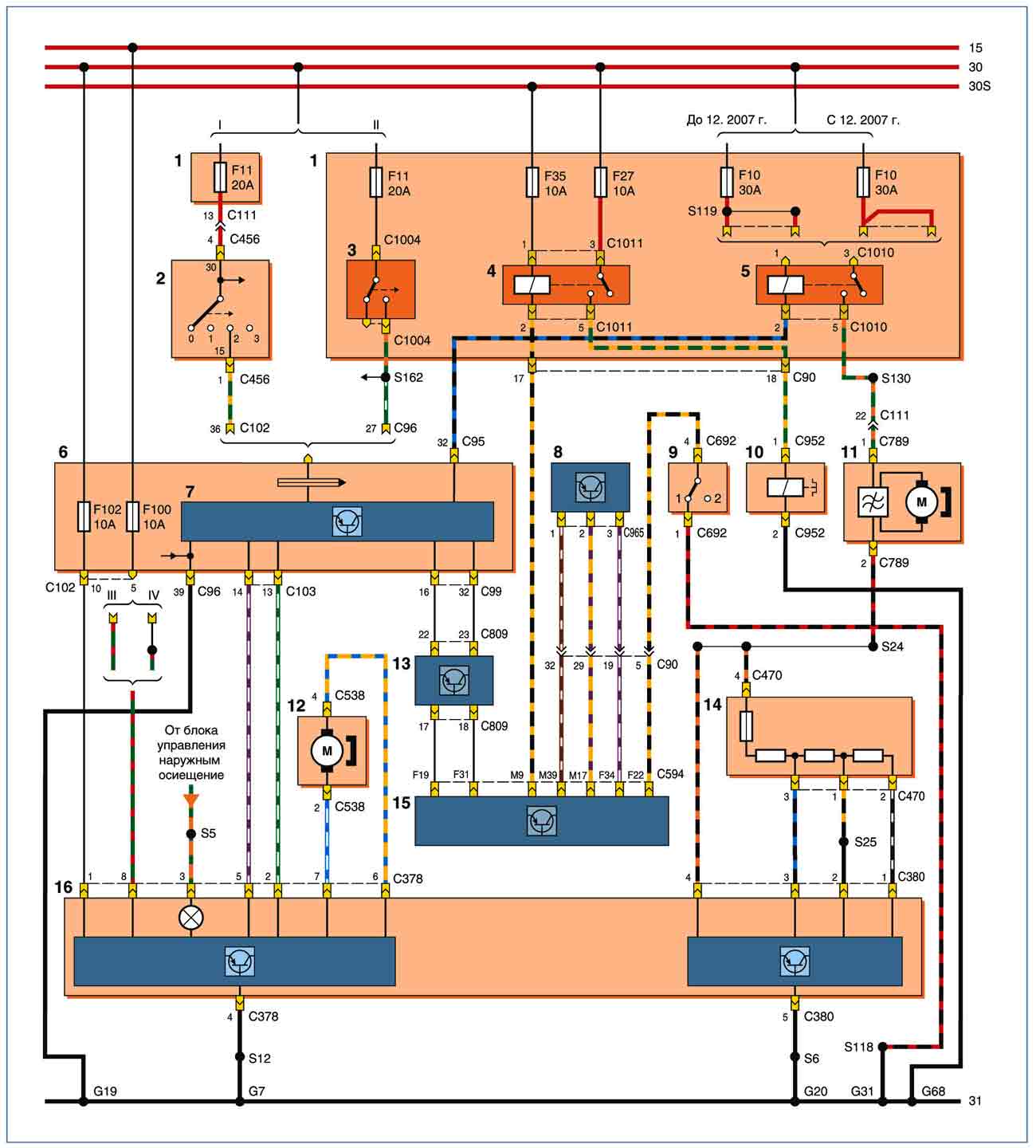 Схема соединений системы кондиционирования: I — не оборудованного системой запуска двигателя без ключа; II — с системой запуска двигателя без ключа; III — без обогрева ветрового стекла; IV — с обогревом ветрового стекла; 1 — монтажный блок в моторном отсеке; 2 — выключатель зажигания; 3 — реле зажигания; 4 — реле компрессора кондиционера; 5 — реле вентилятора отопителя; 6 — монтажный блок в салоне; 7 — блок управления электропакетом; 8 — датчик давления хладагента; 9 — датчик низкого давления хладагента; 10 — муфта компрессора кондиционера; 11 — электродвигатель отопителя; 12 — электропривод заслонки рециркуляции; 13 — комбинация приборов; 14 — дополнительный резистор отопителя; 15 — ЭБУ; 16 — блок управления отоплением, вентиляцией и кондиционированием