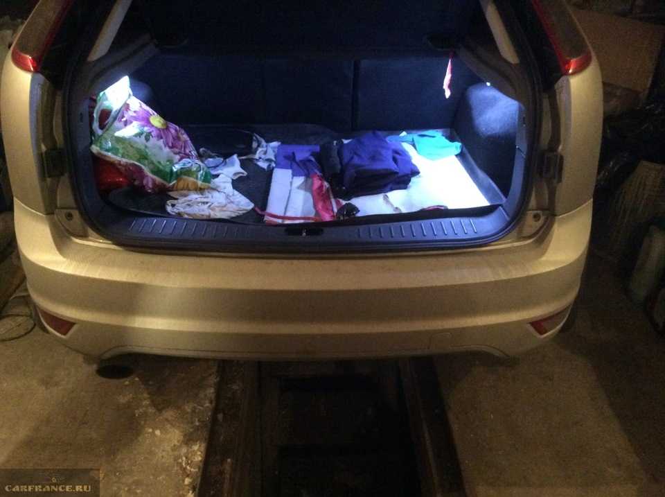- На Фокусах в кузове хэтчбек первым делом отсоединяются контактные колодки фонарей противотуманок и заднего хода. Это делается из-под машины. На седанах, если не установлены датчики парктроника, отключать ничего не нужно.