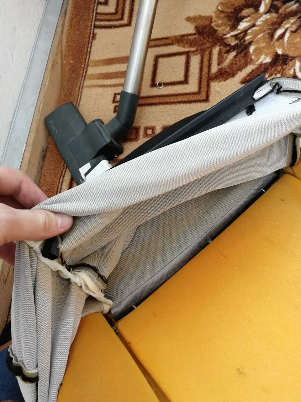 Должна получится такая картина. Далее, чтобы не повредить спицы вытаскиваем их из обивки, для этого засовываем руку под обивку, и в верхних углах, где кончается серая часть обивки, на ощупь вынимаем эти спицы с железного прута и потом тянем вниз, сами спицы в как бы «тряпочном тунеле» обивки изнутри, до конца поймете когда будете разбирать, там все просто.