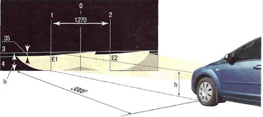 Настройку можно считать успешно выполненной, если верхние окончания левых зон потока света совпадают со значением 4 на схеме, а вертикальные линии 1-2 проходят сквозь точки Е1-Е2, пересекающие наклонные и горизонтальные зоны световых потоков. Также правильная регулировка ближнего света обеспечит надлежащее исполнение функций и фонарей дальнего света. Регулировка противотуманных фар Ford Focus II может производиться по такой же схеме.
