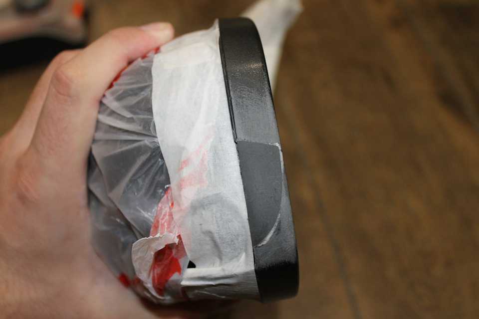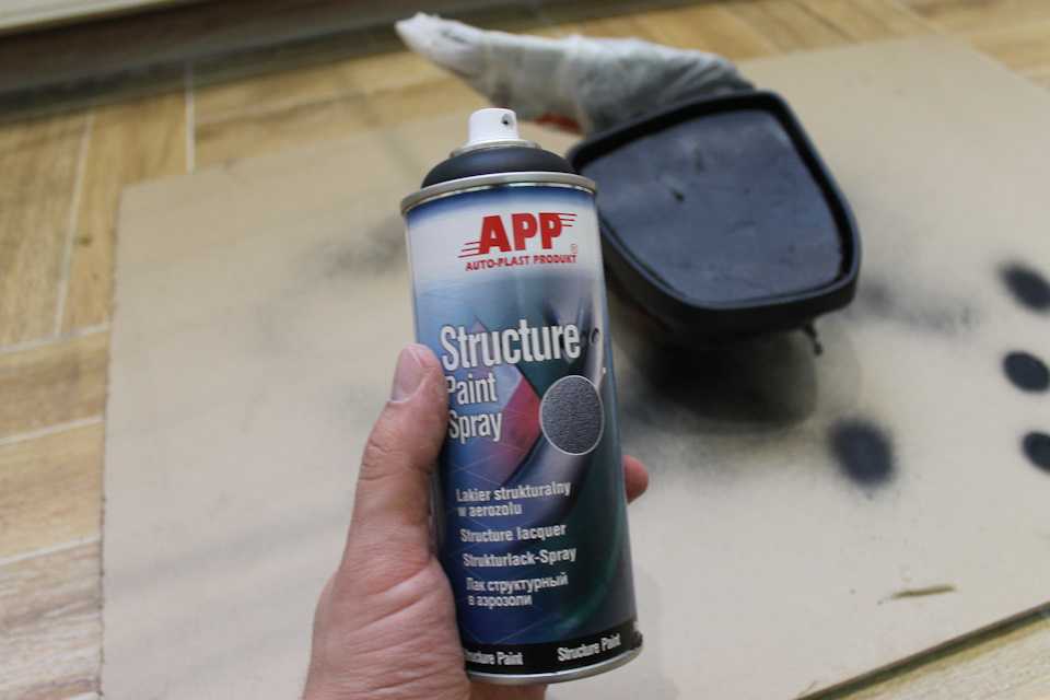 Красить решил только кантик вокруг зеркала. Для этого купил структурную чёрную краску APP. Краска очень понравилась — цвет и структура действительно похожи на родной некрашеный пластик. Сохнет краска быстро.