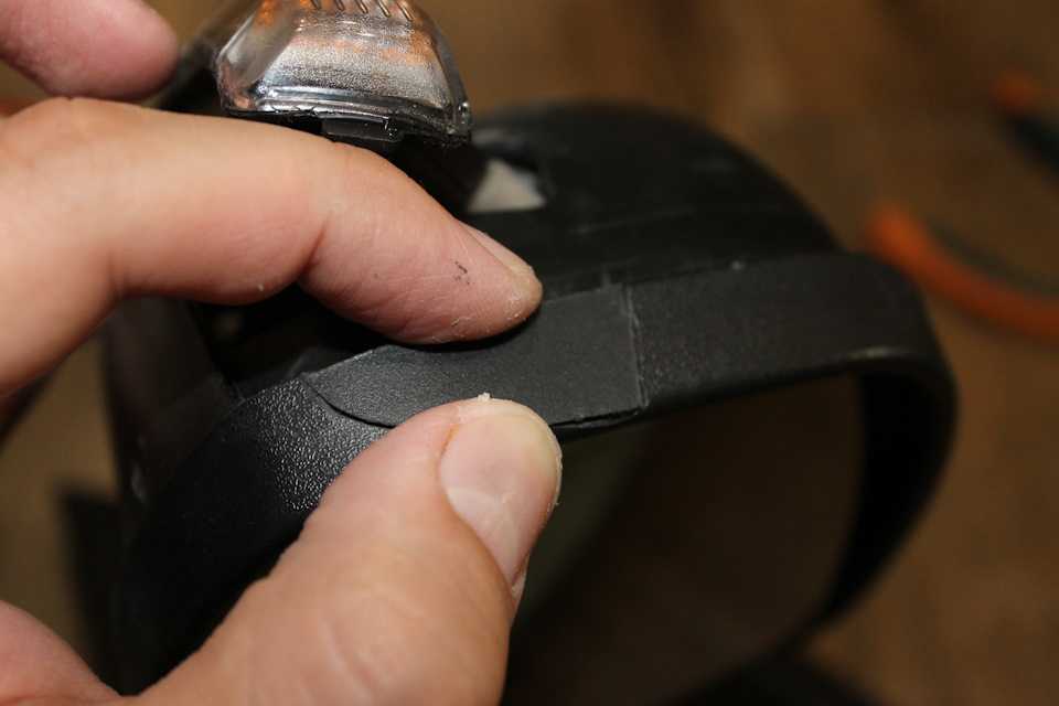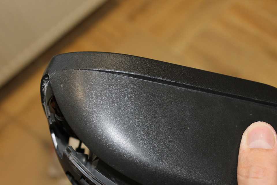 Пришлось немного заколхозить крепление поворотника. Как раз на месте отломанного куска у поворотника ушко, которым он цепляется за корпус зеркала. Ушко ощутимо давит на корпус, и вклееный кусок оно просто вырывало. Решил избавиться от него. Старый поворотник прекрасно держался и без зацепа с ушком (потеряться он не может ни при каких обстоятельствах — он защёлкнут в корпус и прижат за другое ушко накладкой). Собственно, на старом поворотнике так и было — ушко смотрело в пустоту, но снять повторотник без снятия накладки было невозможно. Единственное, он слегка люфтил в своём посадочном месте. В общем, спилил с нового повороника ушко, а проблему люфта решил с помощью куска двухстороннего скотча с той стороны, где оно было. Держится замечательно, ничего не болтается.После вклейки фрагмента зашкурил швы наждачкой P120, P240.