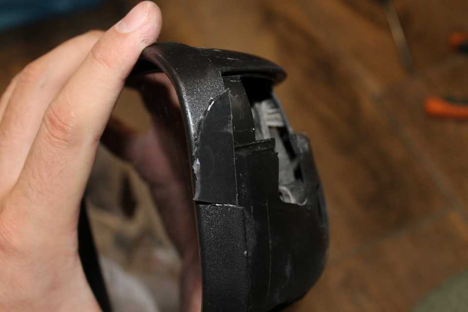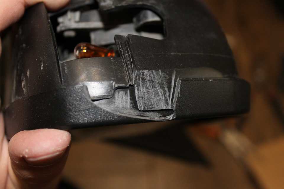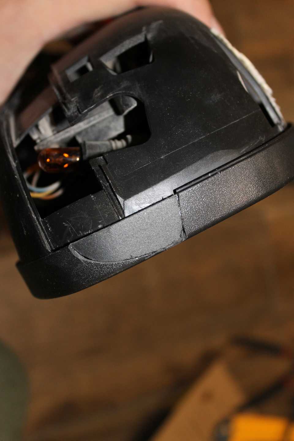 Ремонтировать корпус решил с помощью кусочка пластмассы. В закромах нашлись старые противотуманки от ВАЗ-2110 — из их рамки и позаимствовал кусочек пластика.Снял с зеркала накладку (отщёлкивается сверху плоской отвёрткой, вставленной между накладкой и копусом, а дальше просто снимается вверх), убрал старый поворотник.