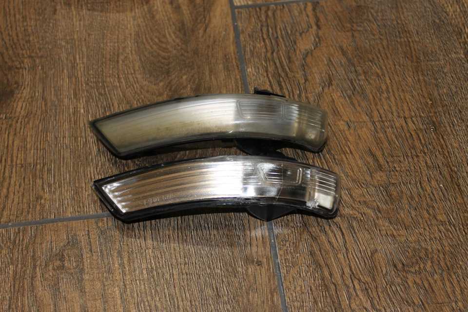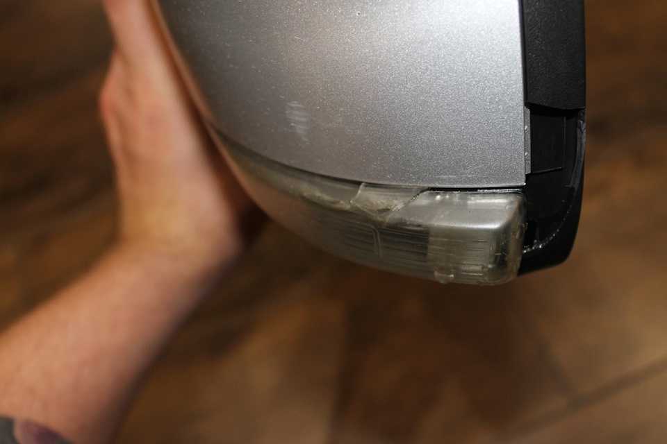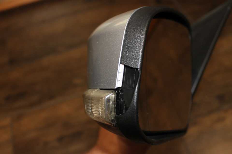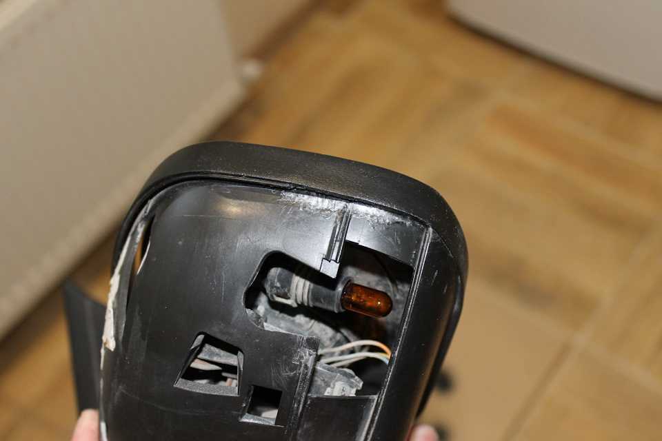 Итак, от зеркала отколот кусочек, поворотник треснут, внутри него грязь. Природа повреждений остаётся загадкой. Сложилось впечатление, что кто-то просто не знал, как правильно снимать поворотник, и при попытке его вынуть сломал корпус. При этом накладка зеркала абсолютно целая, зеркальный элемент целый, подогрев и электропривод прекрасно работают… Ну не менять же из-за такой фигни зеркало целиком?Поворотник купил новый, тайваньской фирмы TYC. Качество — какашка. Склеен криво, чтобы нормально сел, пришлось долго допиливать наждачкой и напильником. Даже защёлка нормально не защёлкивалась в корпусе зеркала — пришло нагревать и разгибать. В общем — фу. Даром что целый и прозрачный.