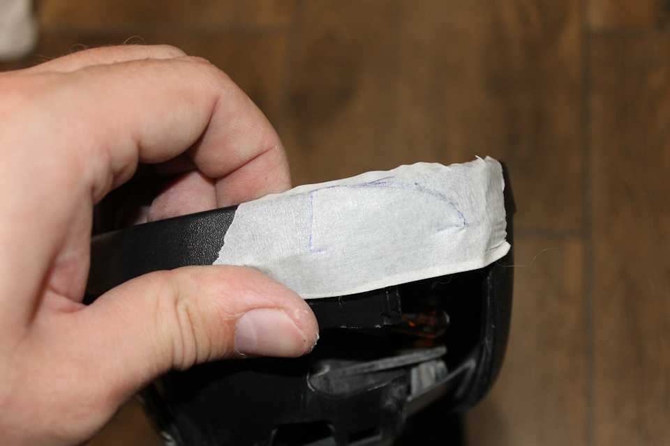 На повреждённое место наклеил кусочек малярного скотча и обвёл контуры будущей вставки. Далее перенёс малярный скотч на донорский пластик и вырезал заготовку канцелярским ножом.