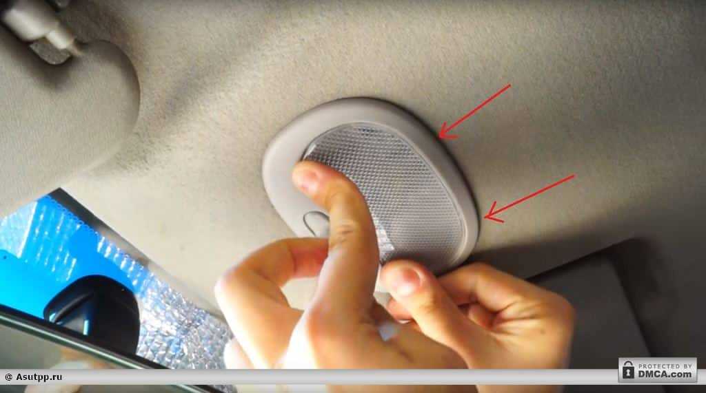 Как видите, возле выключателя находится небольшой паз, выделенный на рисунке красным кругом. Для того чтобы снять рассеиватель, его необходимо поддеть любым плоским предметом. В данном примере ножом поддеваешь плафон и прилагаешь небольшое усилие по направлению внутрь салона.