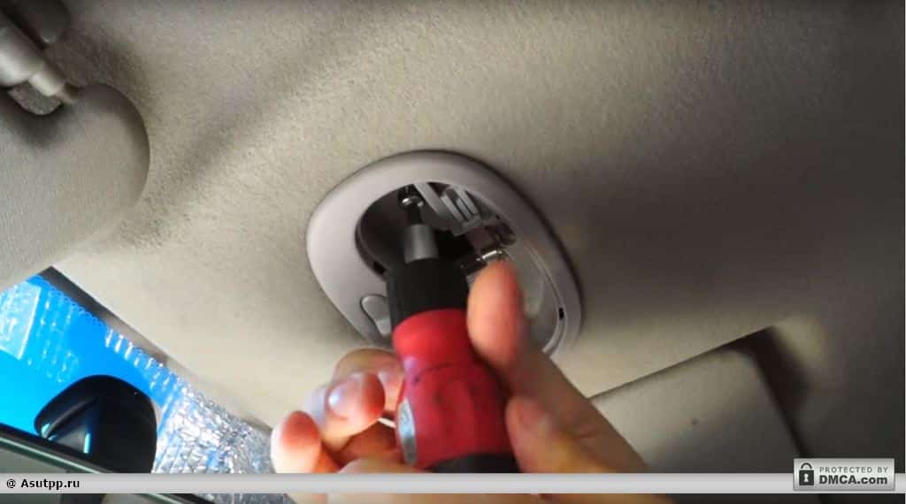 Для снятия плафона шлицевой отверткой поддеваем фиксирующую пружину в его передней части (со стороны ветрового стекла).
