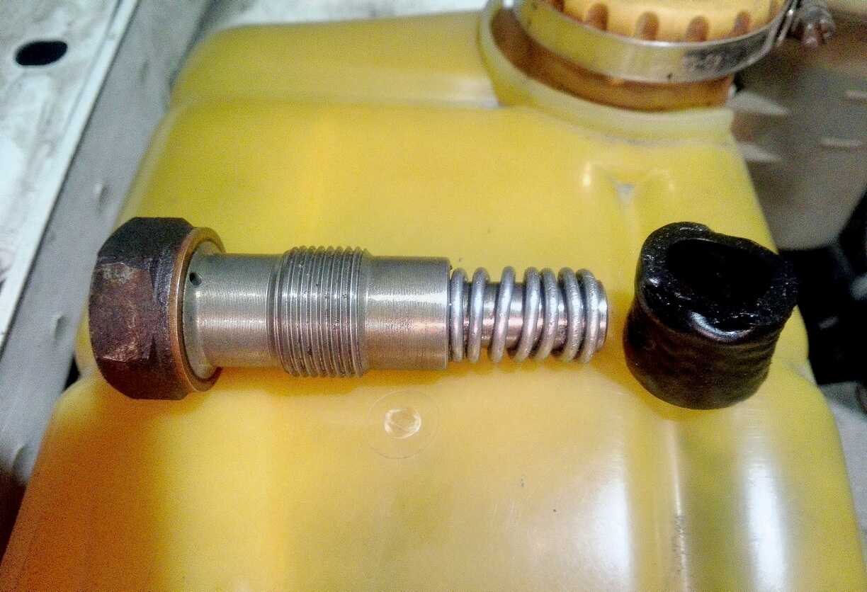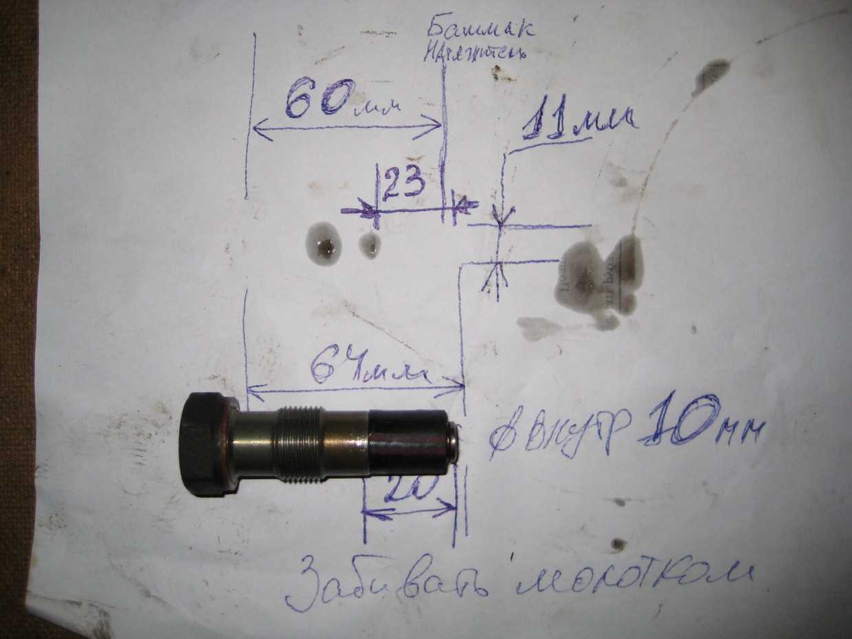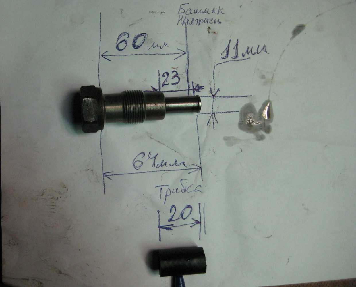 Перед установкой провёл замеры, стержнем надавливал на башмак цепи и замерял длину от плоскости упора на блоке до конца стержня, сила утапливания при замере 3-5 кг, перед этим шток надавливал до 10 кгс, замер веса примерный, по измерениям получается что рабочего хода штока на моём двигателе остаётся 4-5 мм далее шток уже выдвигаться из корпуса толкателя уже не может! По длине резины оставил преднатяг в 2 мм. Надевание трубки на шток, в полости натяжителя есть масло его достаточно для сопротивлению резким нагрузкам, уже размеренную трубку, можно сделать длину на 1-2 мм больше расчётной потом можно укоротить, смазываем внутреннюю часть трубки сам шток маслом, гайку корпуса натяжителя ставим на деревяшку, одеваем трубку на шток и наносим резкий-точный удар по торцу свободного конца резины трёх попыток достаточно для полного надевания резинового элемента. Если у Вас совсем запущенный натяжитель, шток можно удержать парами витками медной проволоки или железной, мелкие царапины на выдвинутой поверхности штока уже ни на что не повлияют.