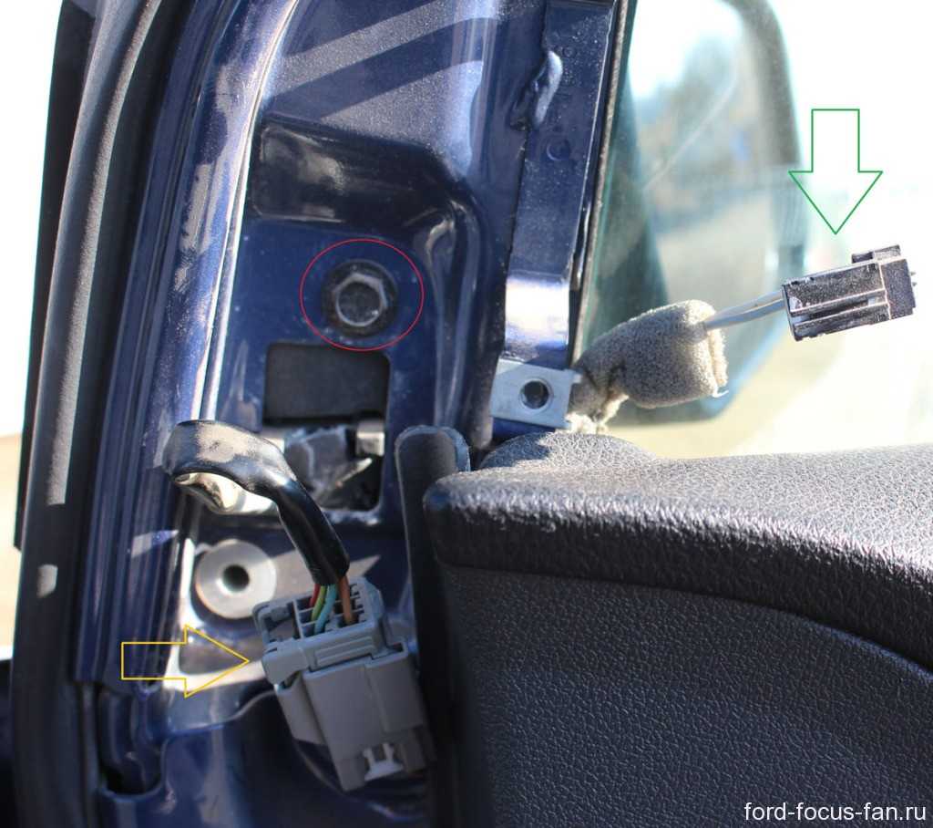 На фотографии выше вы видите красный кружок, которым отмечен единственный саморез под ключ 10, который нужно открутить, чтобы снять зеркало на Форд Фокус 2. Желтой стрелкой показан штекер электрорегулировки, который тоже нужно отсоединить. Зеленой стрелкой указан штекер пищалки.
