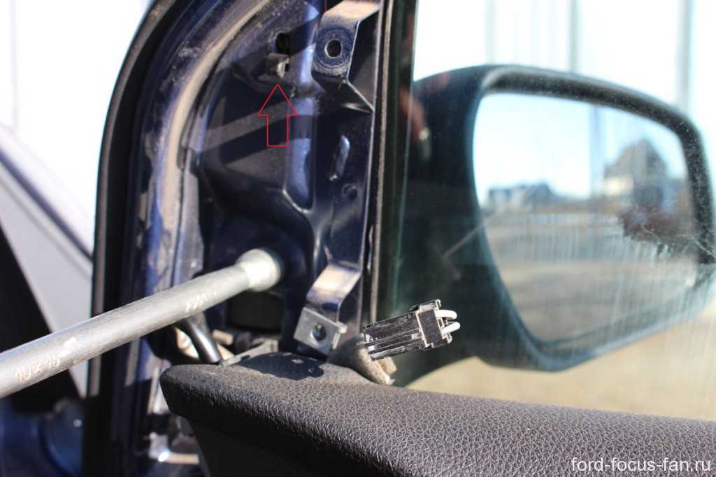 Красной стрелкой на фотографии выше показан фиксатор бокового зеркала Форд Фокус 2. Во время замены, вы просто посадите зеркало на место, этот фиксатор зайдет в паз и зеркало не будет падать, а вы сможете обойти и закрутить саморез.