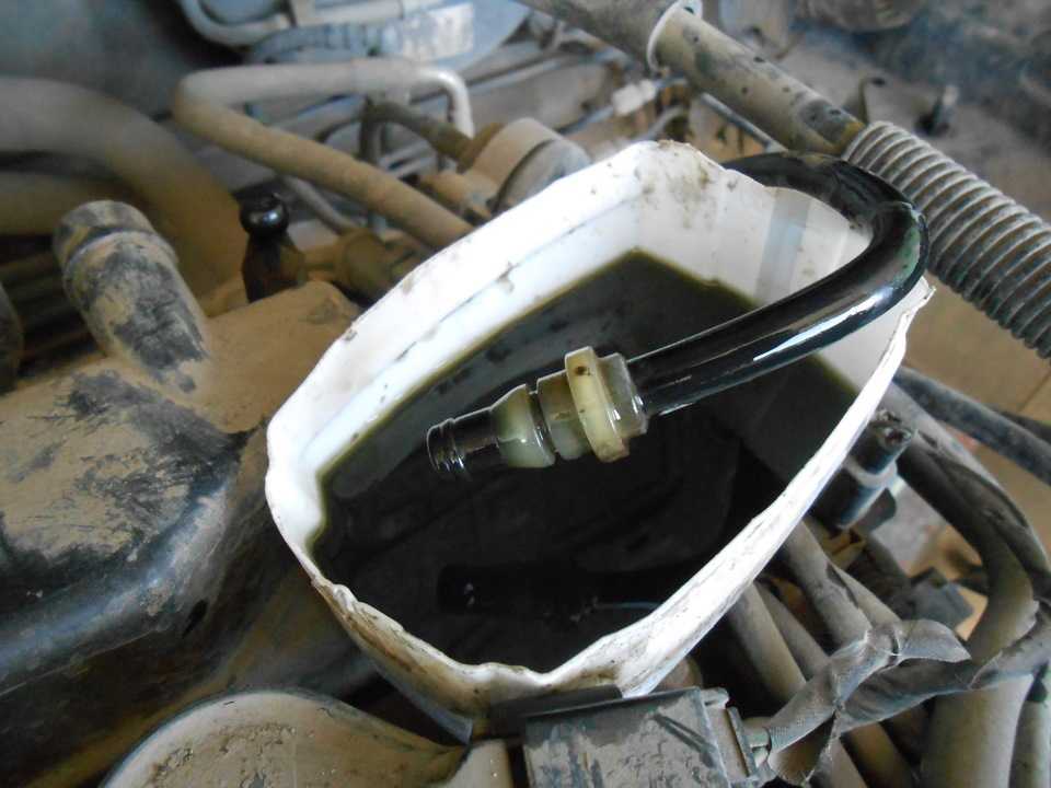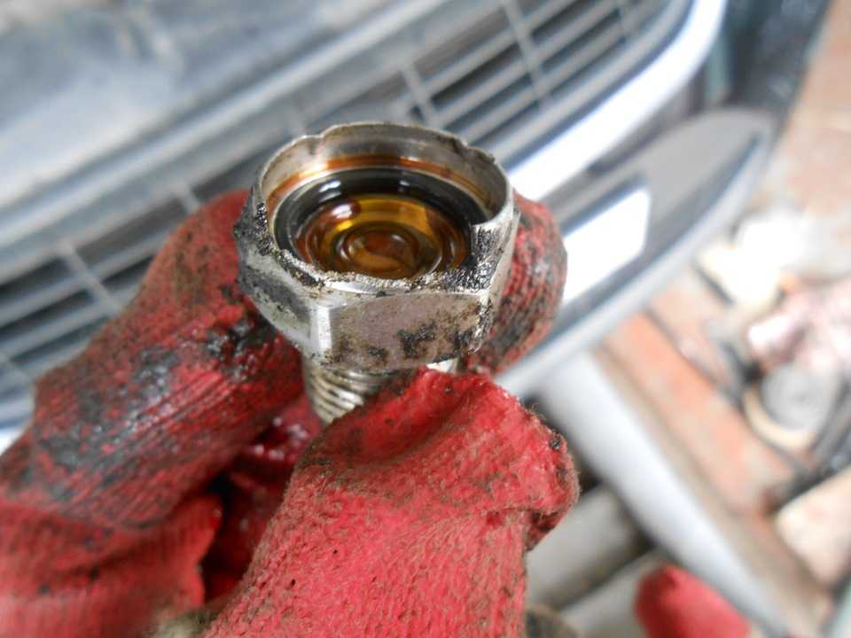 Откручиваем немного клапан (не на полный оборот), придерживая ключом штуцер переходника от основного цилиндра привода выключения. Когда вы это сделаете, в резервуар начнем выливаться старая тормозная жидкость (она будет иметь воздушные пузыри).