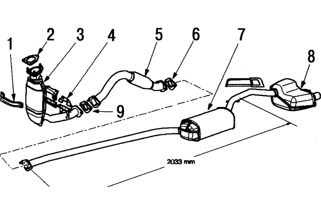 Рис. 316 б. Система выпуска отработавших газов для двигателей с рабочим объемом 1,8 — 2,0 л: 1 — зажим каталитического нейтрализатора; 2 — прокладка; 3 — каталитический нейтрализатор; 4 — кронштейн; 5 — сильфон; 6 — прокладка; 7 — центральный глушитель; 8 — задний глушитель; 9 — прокладка |