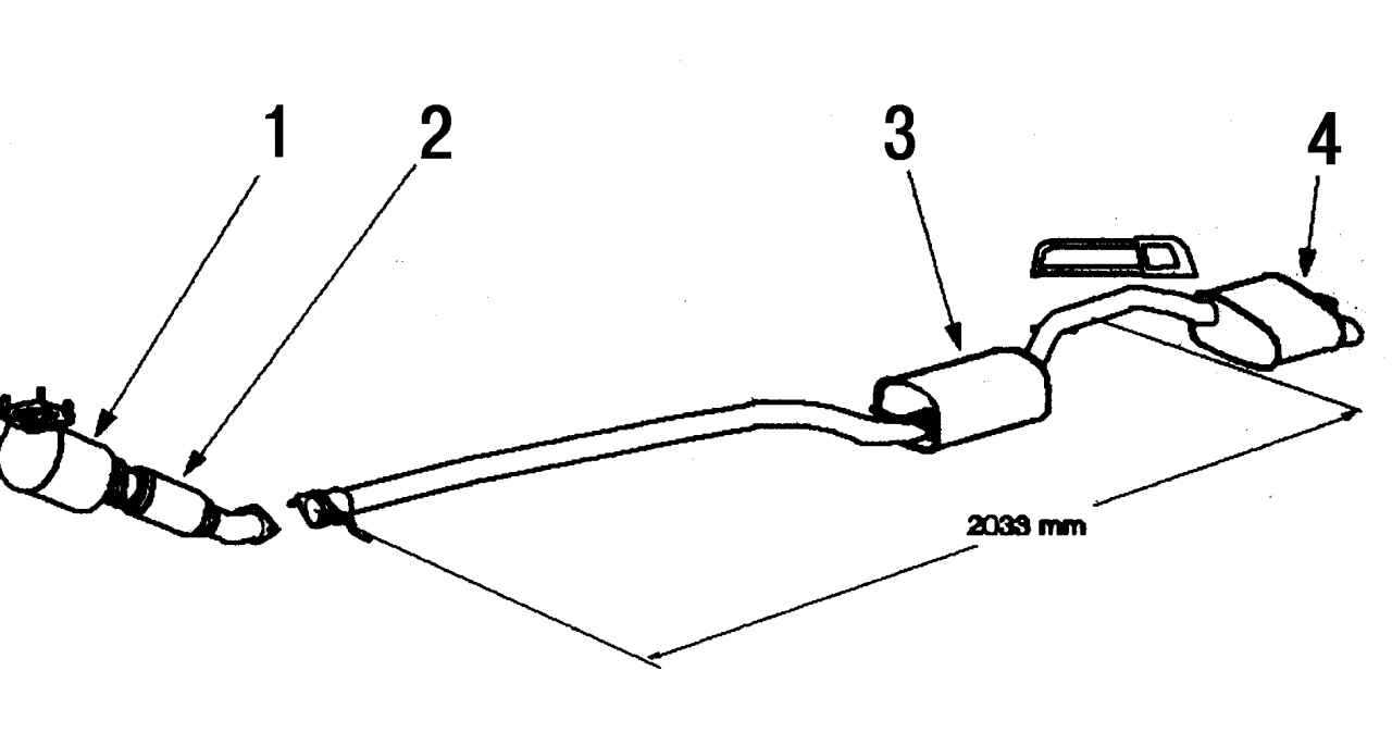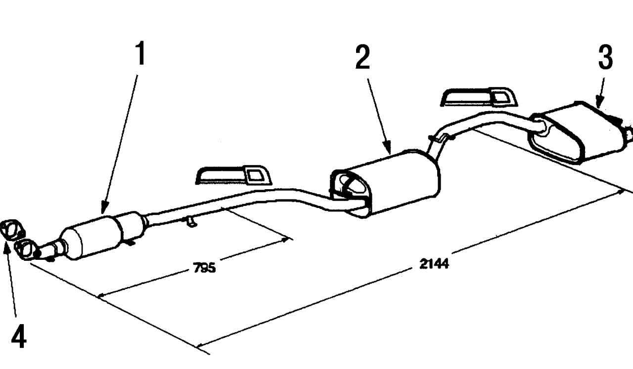 Рис. 316 а. Система выпуска отработавших газов для двигателей с рабочим объемом 1,4 — 1,6 л: 1 — каталитический нейтрализатор; 2 — центральный глушитель; 3 — задний глушитель; 4 — прокладка |