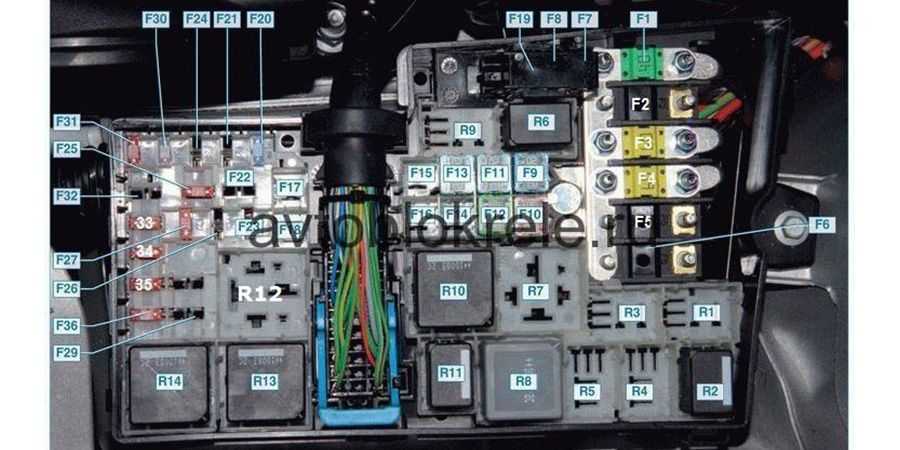 Монтажный блок в моторном отсеке: F1-F36 — предохранители; R1-R14 — реле