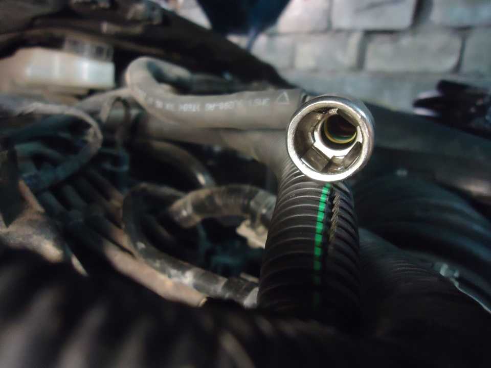- Теперь необходимо найти топливный шланг с зелёной кнопкой на хомуте, подключённый к топливной магистрали. Чтобы его снять, достаточно нажать на зелёную кнопку и потянуть на себя.