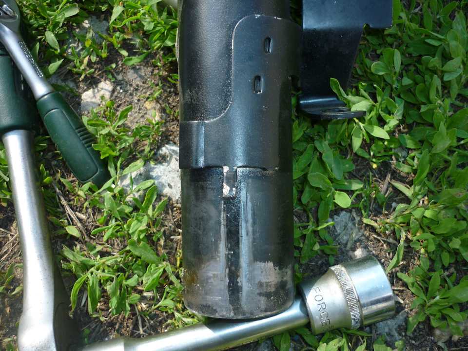 тем самым разожмём кулак так, что долбить по нему молотком при извлечении стойки не придётся, ну и соответственно и зайдёт новая стойка в кулак как по маслу!)Старая стойка с одетыми стяжками
