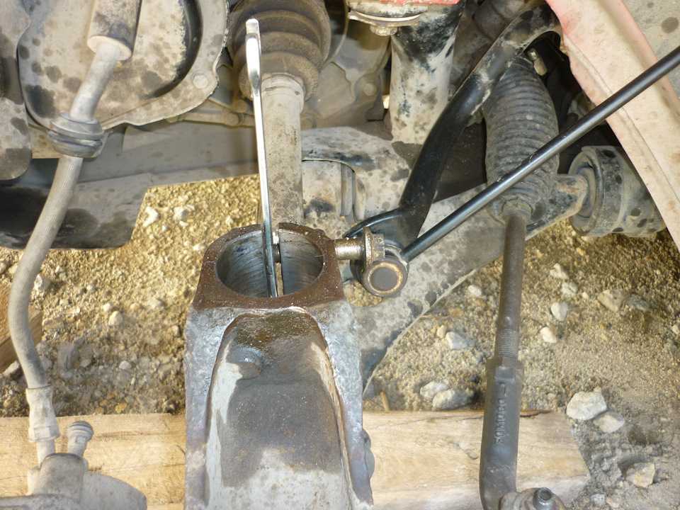 Далее после того как сняли колесо открутили стойку стабилизатора, сняли фишку датчика АБС если такой имеется, выкручиваем болт из поворотного кулака к стойке. Для облегчения извлечения стойки из кулака вкручиваем болт с обратной стороны в заранее в ставленый в прорезь не нужный рожковый ключ например на 14,