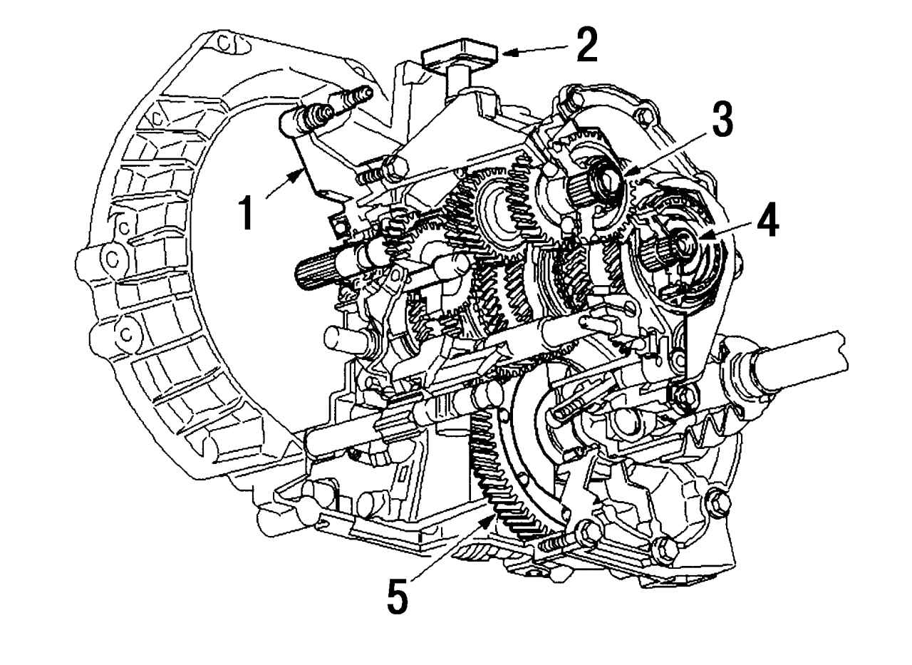 Рис. 221. Коробка передач iB5: 1 — рабочий цилиндр сцепления; 2 — сапун; 3 — первичный вал; 4 — вторичный вал; 5 — дифференциал |