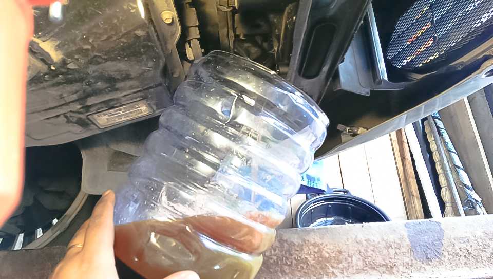 … и сливаем охлаждающую жидкость из системы двигателя в емкость, которую, возможно, придется перемещать по ходу процедуры, поскольку поток жидкости в завершающей стадии превращается в тонкую струйку (как показано на фото ниже).