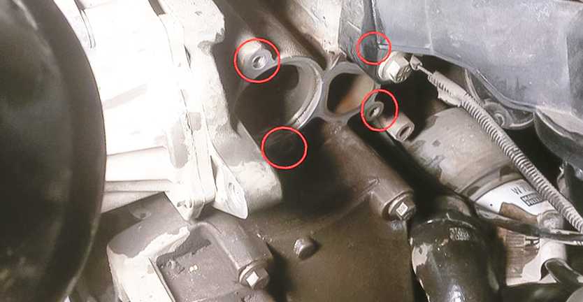 20. Корпус термостата крепится к двигателю четырьмя болтами, два из которых расположены сверху (доступ к ним более открыт), и еще два — снизу. К ним не просто подобраться, поскольку мешают 2 патрубка, надетых на корпус термостата.