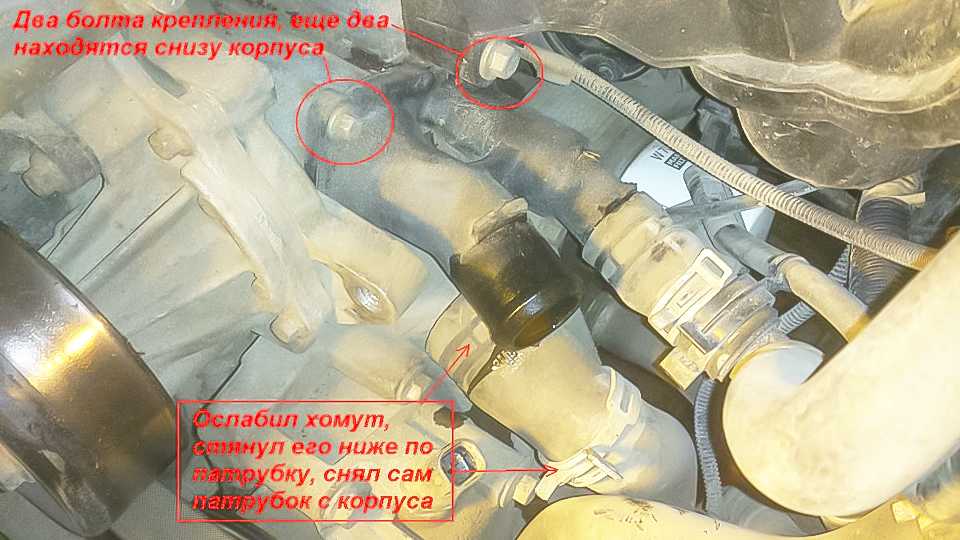 - Только после снятия крышки можно будет демонтировать нижний патрубок. Стоит очень аккуратно снимать крышку термостата, часто болты обламываются, их приходится высверливать. Можно использовать WD-40 для снятия возможного окисления и ржавчины.