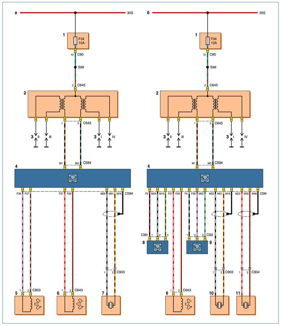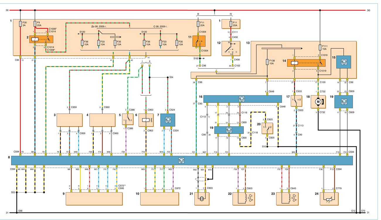 Схема электронной системы управления двигателем: I — с ABS и ESP; II — без ABS и ESP; III — с системой запуска двигателя без ключа; IV — не оборудованный системой запуска двигателя без ключа; 1 — монтажный блок в моторном отсеке; 2 — главное реле; 3 — управляющий датчик концентрации кислорода; 4 — диагностический датчик концентрации кислорода; 5 — датчик давления в системе гидроусилителя рулевого управления; 6 — клапан продувки адсорбера; 7 — датчик скорости автомобиля; 8 — ЭБУ; 9 — дроссельный узел; 10 — датчик абсолютного давления и температуры воздуха; 11 — реле зажигания; 12 — выключатель зажигания; 13 — монтажный блок в салоне; 14 — реле топливного насоса; 15 — блок управления электропакетом; 16 — датчик положения педали «газа»; 17 — аварийный выключатель системы подачи топлива; 18 — топливный насос; 19 — комбинация приборов; 20 — датчик положения педали сцепления; 21 — датчик детонации; 22 — датчик фаз; 23 — датчик положения коленчатого вала; 24 — датчик температуры охлаждающей жидкости * с 08. 2009г. ** с двигателем 1,4