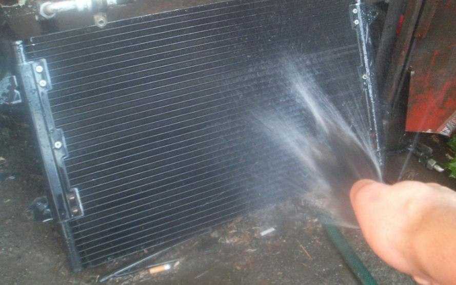 - Получив доступ к конденсору, надо вначале промыть его несильной струей воды изнутри, а затем снаружи. Очистка таким способом производится несколько раз, попеременно — изнутри и снаружи. Желательно, перед тем как почистить конденсор, обработать его поверхность снаружи и изнутри специальной жидкостью очищающей от насекомых. Чистка не должна производиться струей под большим напором, потому как есть большая вероятность повреждения пластинчатых переборок сот радиатора.