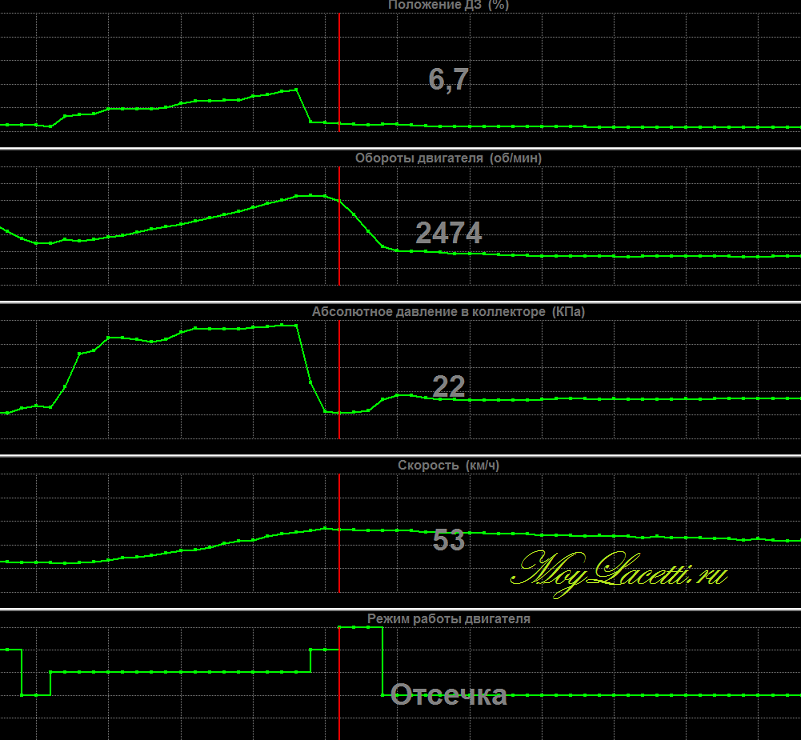 Допустим, скорость автомобиля составляет 55 км/ч, обороты двигателя 2600 об/м. Мы отпускаем педаль акселератора, положение ДЗ становится минимальным, ЭБУ это видит и включает режим отсечки, выключая подачу топлива через форсунки. Это позволяет более эффективно использовать торможение двигателем, повышая безопасность и увеличивая ресурс тормозной системы, а также экономить топливо и в разы уменьшить выброс вредных веществ в нашу с Вами атмосферу.